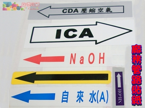 2. 尤其是工廠或大樓管路複雜為安裝與維修方便,分別在各類廠務管理管路外表加以標示各種不同功能管路貼紙、管路標示,管路指示貼紙、標籤 管線貼紙。