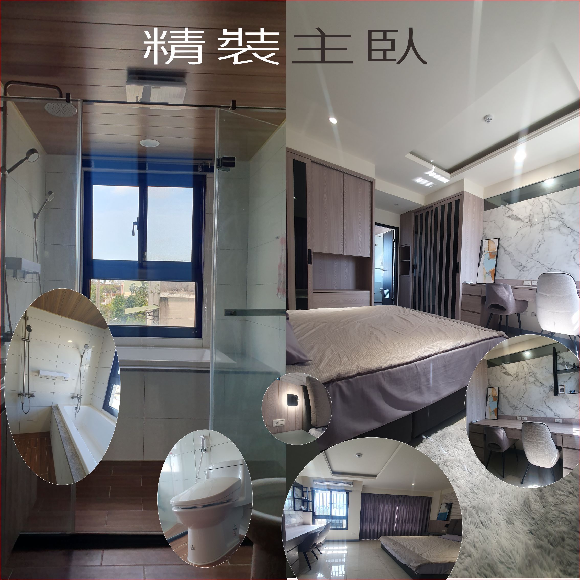 精緻裝潢主臥室,加大雙人床,舒適工作區,乾溼分離浴室,對外開窗,單人浴缸,免治馬桶