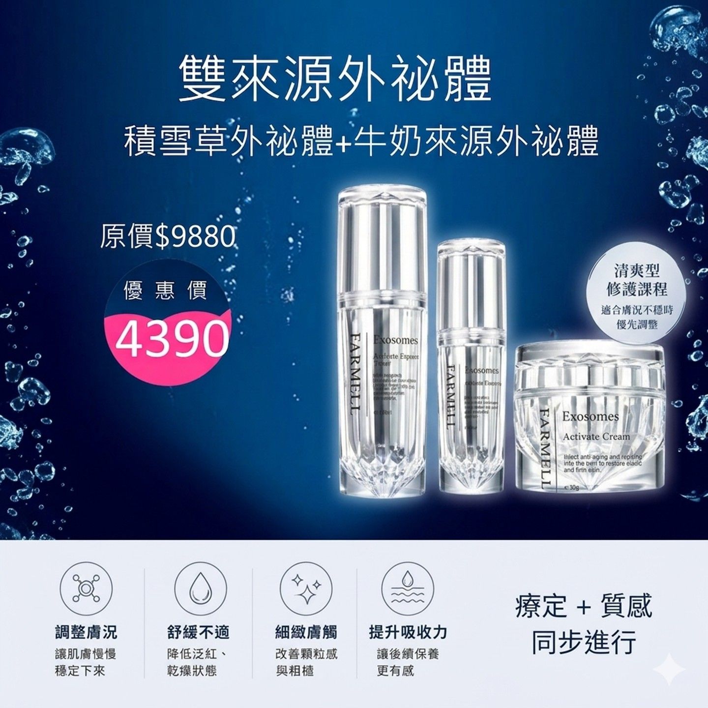 保養不該只是例行公事,而是一段專屬自己的療癒時光這次特別為您準備了備受喜愛的「外泌體極致保養三部曲」,從打底到鎖水,給予肌膚最完整的寵愛!第一步「潤澤修護液」:宛如清晨的朝露,質地清透極易吸收,能迅速為乾渴的肌膚補滿水分,溫柔喚醒臉龐,為後續保養完美打底 第二步「極致精華液」:滴滴蘊含珍貴精萃,將滿滿的滋養深層注入,讓肌膚呈現飽滿彈潤的絕佳觸感,由內而外散發迷人透亮的光澤第三步「奢華精質霜」:絲絨般滑順的豐潤質地,輕抹瞬間便能將所有精華緊緊鎖住。它能在肌膚表面形成一道隱形的保護膜,維持長效水潤卻輕盈不黏膩這套無縫接軌的三步驟,給予肌膚全方位的細緻呵護每天只需短短幾分鐘,就能感受膚觸一天比一天更加細滑Q彈邀請您將這份頂級的保養體驗帶回家,讓自己隨時隨地都綻放自信優雅的光采!